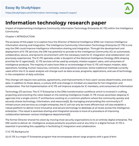 The first commercially available relational database management. The paper concludes with a recommendation for the implementation of Information Technology. RSS feed 20. What term refers to your ability to download audio and video files into a handheld, portable device? D. Maintenance 16. Which of the following is a characteristic of a proposed system that is essential to the success of your organization? C. Cloud and utility computing provides the opportunity of concentrating on operational expenses rather than dealing with woes of capital investment. Keep on browsing if you are OK with that, or find out how to manage cookies. Sample introduction for term paper. Research Paper Introduction ... And the big data and knowledge management will empower the employees to utilize the customer data to provide customized and personalized customer services to retain repeat customers and to build a brand name as Zappos does. When you are using a Web-based server to run applications, what issues should you be concerned with? A. The former involves getting a product or service into the market, promoting. For example, you can discuss the impact of information technology on medicine, student, youth and culture, on education in general, on popular culture, on finance and much more. What type of technology would allow a customer in a SOA environment to connect to any communications channel (e. g., fax or Web) in an organization? C. A structured approach for developing information systems 8. |