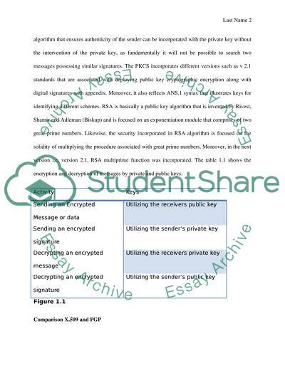 There are different levels of uncertainty when faced with ethical decisions; each creates a sort of ring around the dilemma. Social networking sites create a community of people; blogs keep people informed 19. And the big data and knowledge management will empower the employees to utilize the customer data to provide customized and personalized customer services to retain repeat customers and to build a brand name as Zappos does. Isolated Islands of computing power were not in synch with business demand of global market (Starkey, 2009). A term paper is a research paper required at the end of a school semester. Re-read your assignment sheet and any information in the textbook. Information Technology and Public Key Cryptography Essay Example ... The collaboration of Tesco IT team with Microsoft Corporation in implementing Azure leverages the scalability of retail giant with new API services (Lansley, 2009). Which of the following is not one of these methods? C. It is inevitable that advancements of autonomous robots will change people lives in a number of ways. RSA is basically a public key algorithm that is invented by Rivest, Shamir and Adleman (Biskup) and is focused on an exponentiation module that comprises of two great prime numbers. Likewise, the primary objective is to grant access to Internet complaint services that will utilize signatures based on certificate and encryption features without human intervention. Activity Keys Sending an Encrypted Message or data Utilizing the receivers public key Sending an encrypted signature Utilizing the sender’s private key Decrypting an encrypted message Utilizing the receivers private key Decrypting an encrypted signature Utilizing the sender’s public key Figure 1.1 Comparison X.509 and PGP X.509 is considered to be an ITU-T standard that is known for Public Key Infrastructure (PKI). |