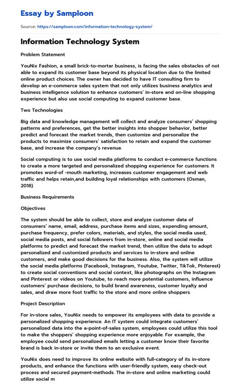 Which phase is devoted to creating a solid plan for developing your information system? B. It will be easier to rent or buy a robot which will help you to an inspection. Technology 17. Which of the following statements successfully differentiates the term MIS from IT. Take for instance Ethics and Information Technology: A Case-Based Approach to in Transition Health Informatics. Which of the following deals with the planning for, development, management, and use of information technology? B. Which of the following protects the intangible creative work that is embodied in physical form? B. Technology Topics For Research Paper by dazzlingcorps - Issuu As a result, YouNix has to implement technology into the business process to improve the effectiveness and efficiency of the business operation process. Take for instance Ethics and Information Technology: A Case-Based Approach to in Transition Health Informatics. The employees should be able to utilize the big data to serve the shoppers in a personalized way (e.g. sending email for the items back-to-store, or new item arrival, birthday coupon, flash-sale notice, limited-time discounts, and company events) to maximize their satisfaction so that word-of-mouth marketing could draw more shoppers to the company. Anything stored is data, but it only becomes information. The primary objective or reason for this standard is the construction of digital envelops and digital signatures. If you were traveling abroad and needed to use some software that you did not currently have, and did not want to purchase, what type of software could you rent during this trip? D. |